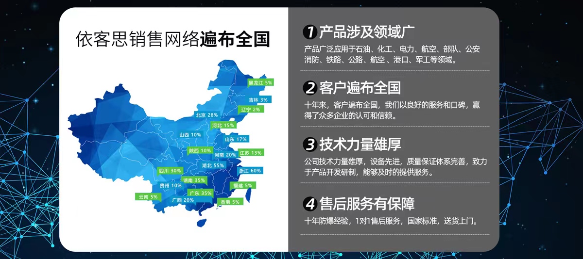 依客思防爆專注于防爆產(chǎn)品的研發(fā)、生產(chǎn)與銷售,主要產(chǎn)品有:防爆操作柱、BXCQ防爆靜電釋放儀、BZC系列防爆操作柱、不銹鋼現(xiàn)場操作箱、BXM(D)防爆照明(動力)配電箱、BXX防爆檢修箱、BXJ防爆接線箱、LED防爆燈、防爆管件、防爆風機等產(chǎn)品,型號規(guī)格齊全,廣泛適用于煤炭、電力、醫(yī)藥、石油、化工、航空等領(lǐng)域。我公司產(chǎn)品質(zhì)量過硬,價格實惠,銷售范圍廣,且與各大型企業(yè)建立了良好的合作關(guān)系,同時還遠銷中、東亞和北美等地區(qū),深受用戶喜愛與青睞。